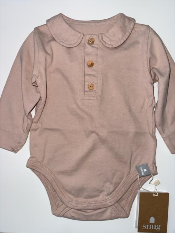 Body 100% algodón orgánico con cuello peter-pan. Cierra con botones de madera al frente y broches en la entrepierna.