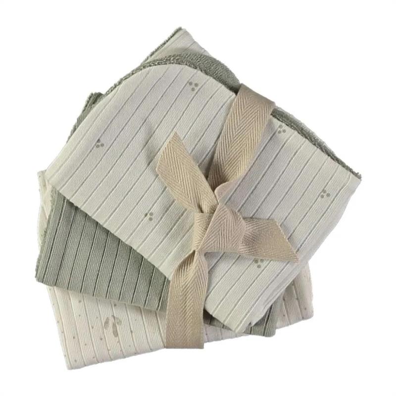 CARACTERÍSTICAS: Composición: 100% algodón orgánico Medidas de cada toallita: 30 x 25 cm Interior: suave rizo Exterior: 100% algodón orgánico Lavar en lavadora a 30º No usar secadora