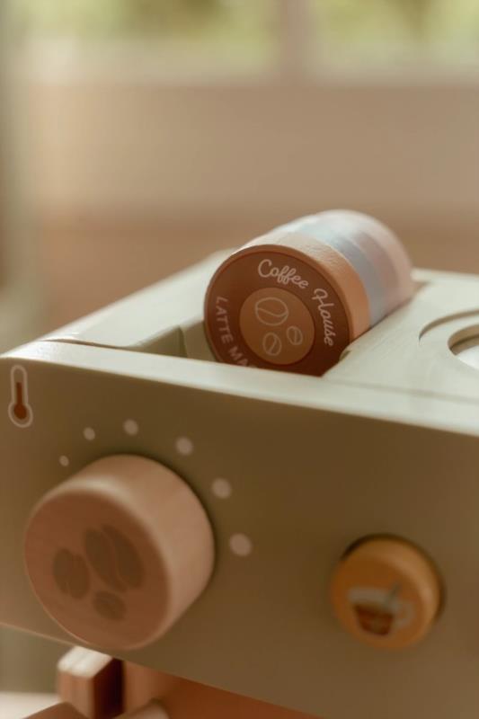 ¡Hora de una deliciosa taza de café o té! Con esta cafetera de madera, los pequeños baristas pueden moler granos, insertar cápsulas de café y remover su bebida con una cuchara. El set incluye dos tazas, dos cucharas, una jarra de leche, cartones de leche e incluso plantillas de capuchino para una auténtica experiencia de café. La parte trasera de la máquina presenta alegres ilustraciones. ¡Perfecta para combinar con el rincón de juego de café y divertirse aún más! ¿Hoy será café o té?