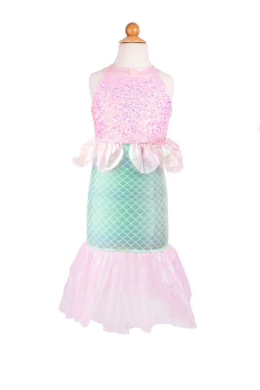 Vestido de sirena Misty Mermaid en color rosa. Con un diseño que simula una cola de pez y un top brillante, disponible en la talla 3-4.