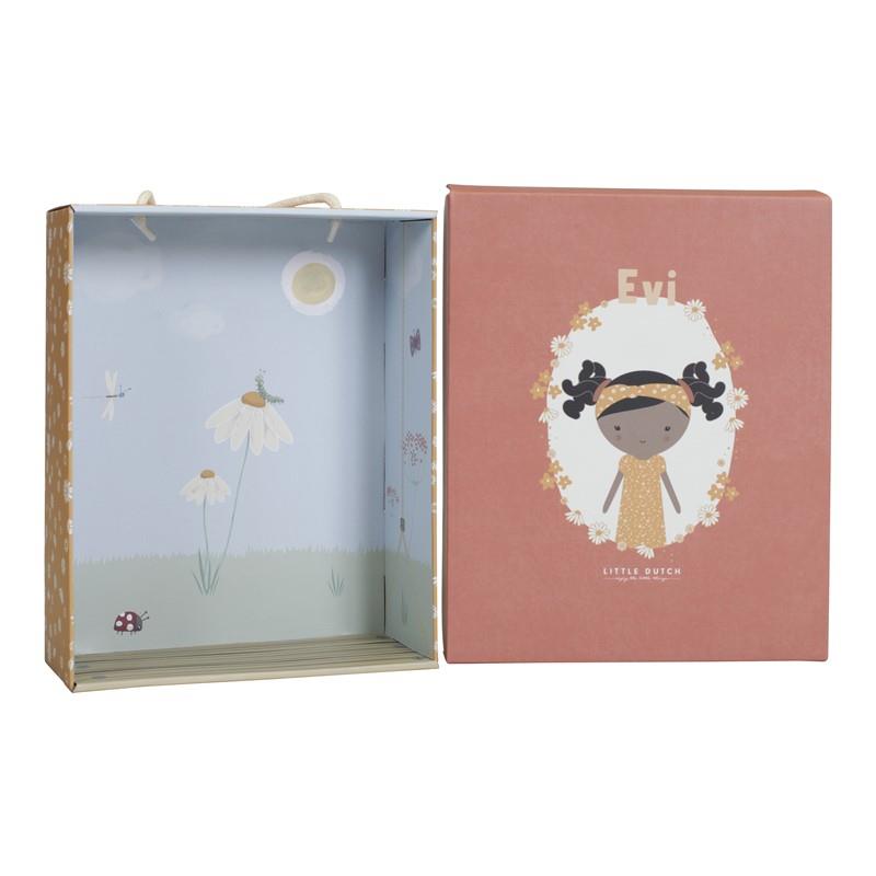 Conoce a la encantadora Evi. Esta muñeca de peluche de Little Dutch con un lindo vestido quiere ser abrazada. Evi puede sentarse y le gusta ir contigo en el cochecito de muñecas de Little Dutch. La muñeca viene en una hermosa caja de almacenamiento. La muñeca Evi mide 35 cm de altura.