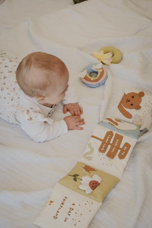 "Fabric Book – Fairyland takes Bear and Bunny on a magical journey through an enchanting world. Join them as they meet shimmering fairies, dancing butterflies, and hidden flower meadows full of surprises. Made from 100% organic cotton, this fabric book features five soft, squeezable pages with lovely colours and crinkle paper to keep little ones curious, engaged, and smiling. Age recommendation: 0m+ EU Toy Safety Standard – CE"