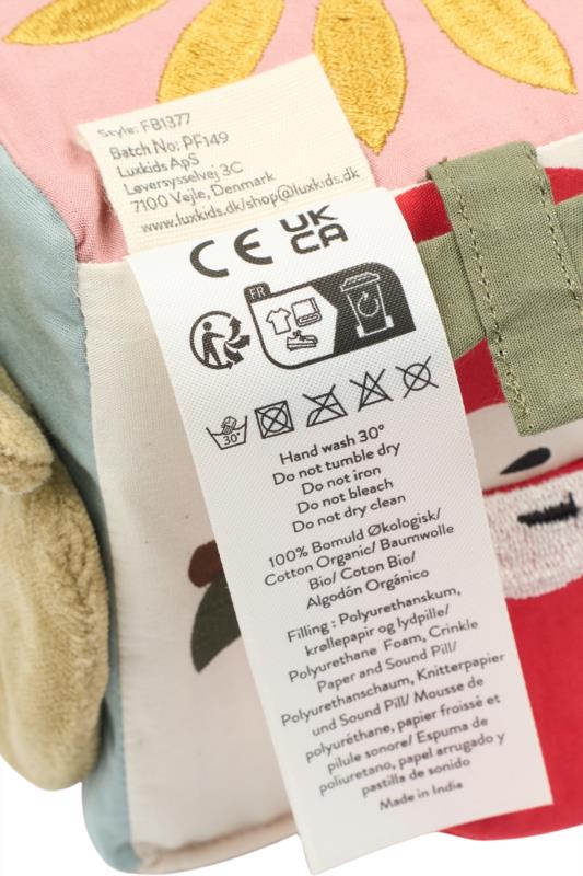 "Fabelab's Fabric Cube is a playful toy for the babies. A perfect on-the-go toy to strap onto the stroller, bedside or car seat to let your little one explore the different beautiful colours, textures and shapes. Fabelab's Fabric Cube contains many activities that stimulate the baby’s senses! The Cube lets your little one develop senses and skills and it's the perfect size for a little hand. Age recommendation 0m+ EU Toy Safety Standard - CE"