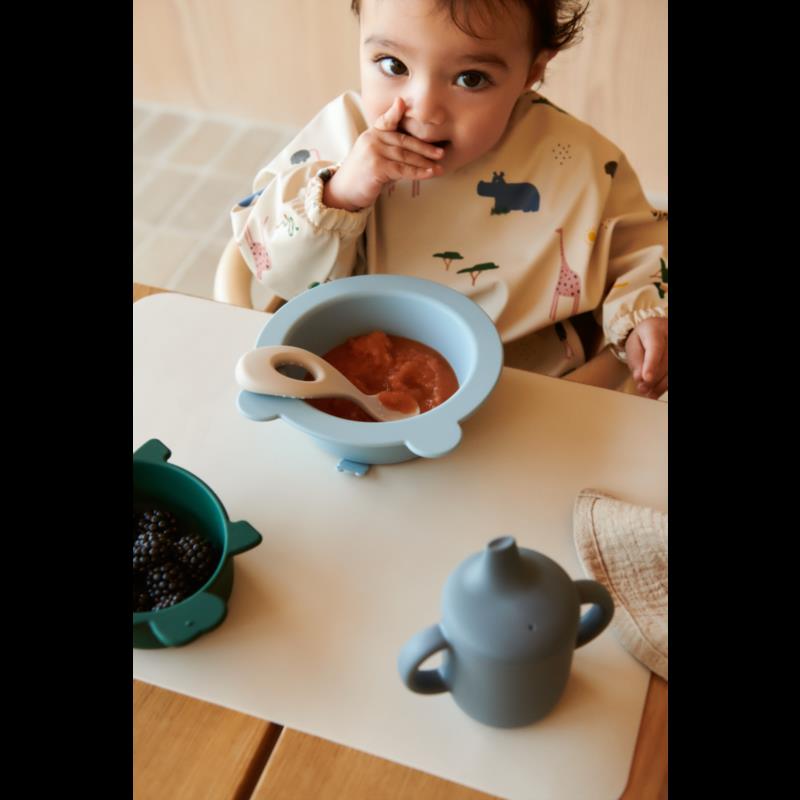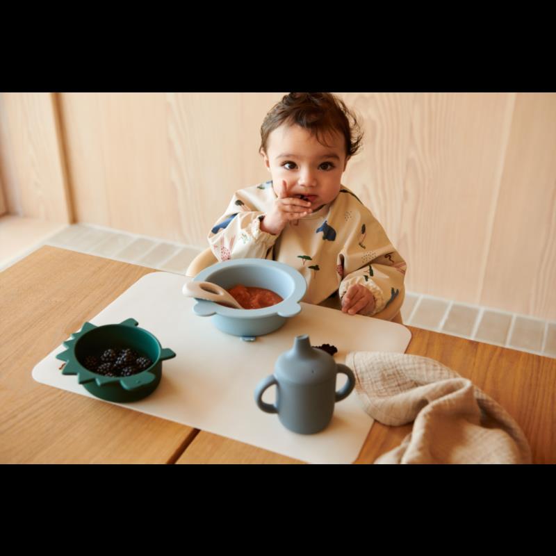 BIB WITH LONG SLEEVES Lightweight cape bib for children who are learning to eat. The recycled material makes it instantly re-usable: simply rinse and wipe clean. ABOUT Waterproof Long sleeves Elasticated cuffs Catch-all front pocket