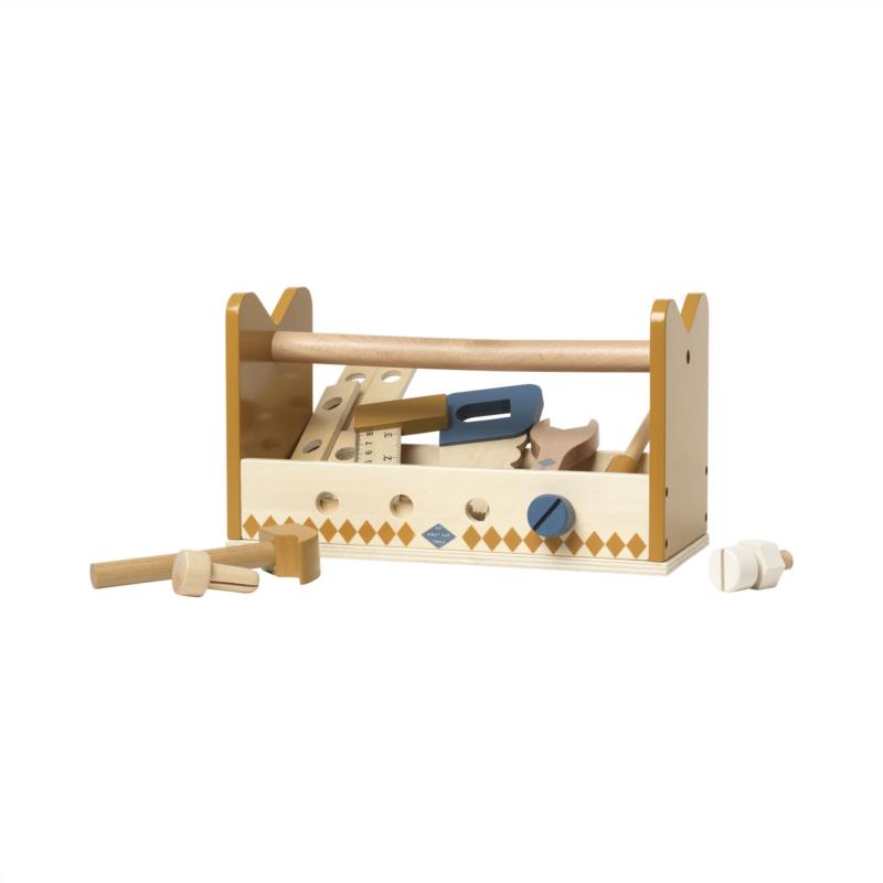 Do you have a little builder at home? Then this set is perfect! My First Tool Set from Fabelab has many hours of busy building for little builders. A great set with beautifully decorated play tools and small nuts & bolts, a hammer, and wood pieces to put together. My First Tool Set is a wonderful playful product that also may aid fine motor skills and develop an interest in building something with your very own hands.The Tool Set has a good handle at the top, so it is easy to transport all your tools to your next building project. It contains the following tools: a hammer, a screwdriver, a wrench, a saw, a ruler, various nuts, bolts and pieces of wood. The wooden tools have rounded corners that fit well in your little ones' hands. The Box has smart holes that the screws can be screwed into for extra fun. My first Tool Set is similar to a real Toolbox and contains everything you need to make your little one feel like a little craftsman. The Tools stimulate creativity while developing the child's coordination and motor skills.