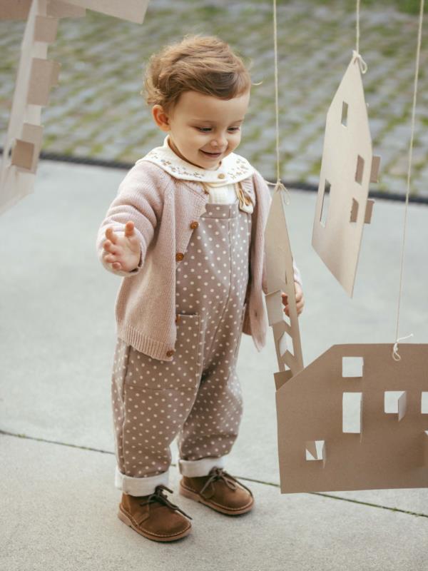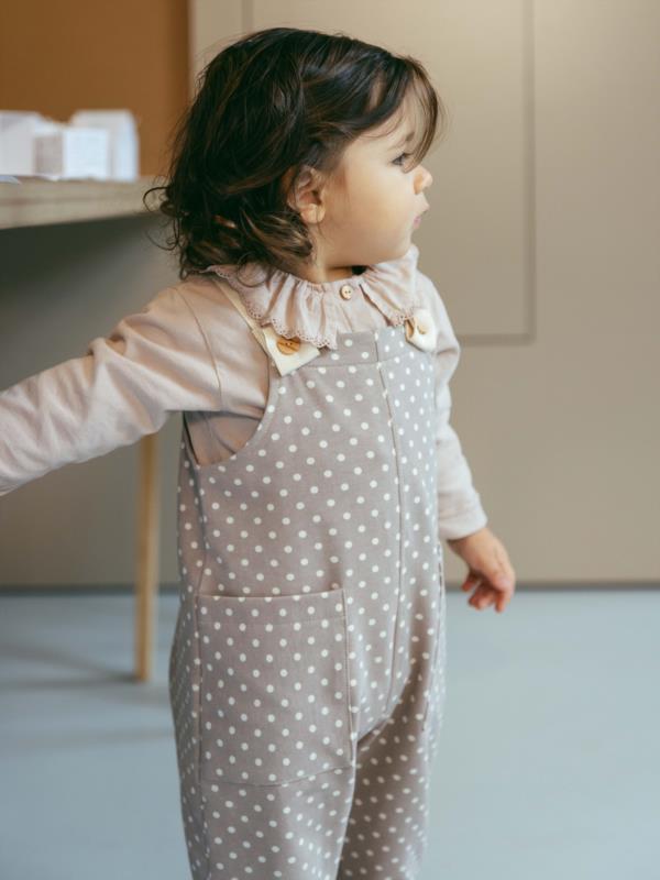 Peto estampado de felpa cardada con algodón orgánico muy maleable y cálido. Bolsillos funcionales al frente. Cierra con botones de madera en los tirantes en dos posiciones y broches en la entrepierna hasta los 12 meses. La bota se puede llevar doblada o entera para mayor durabilidad.