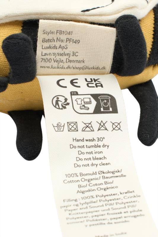 "Rattle - Bolette the Bee Meet Fabelab's buzzing Bee character Bolette. Bolette buzzes and rattles around among the beautiful flowers and friendly creatures in the colourful orchard. With her big, scratchy wings, sound pill and composition of different textiles she is designed to entertain and stimulate your little one! Age recommendation: 0M+ EU Toy Safety Standard - CE"