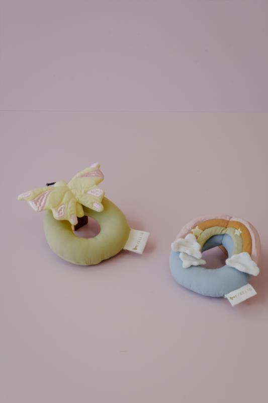 "Rattle – Rainbow is easy for little hands to hold and grip. The woven cotton fabric offers a soft, tactile surface, encouraging your baby to explore different sensations as they grasp and shake the rattle. The gentle rattling sound provides auditory stimulation and supports your baby’s sensory development – all wrapped in a magical rainbow from the world of Fairyland. Age recommendation: 0m+ EU Toy Safety Standard – CE"