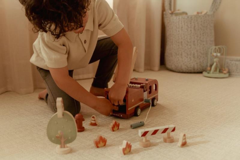 ¡Rescata al gato del árbol! Este camión de bomberos de madera tiene una escalera extensible y una manguera desmontable que se puede conectar a la boca de incendios o al camión. Incluye cuatro bomberos, llamas y una boca de incendios. ¡Perfecto para combinar con la estación de bomberos y disfrutar aún más jugando!