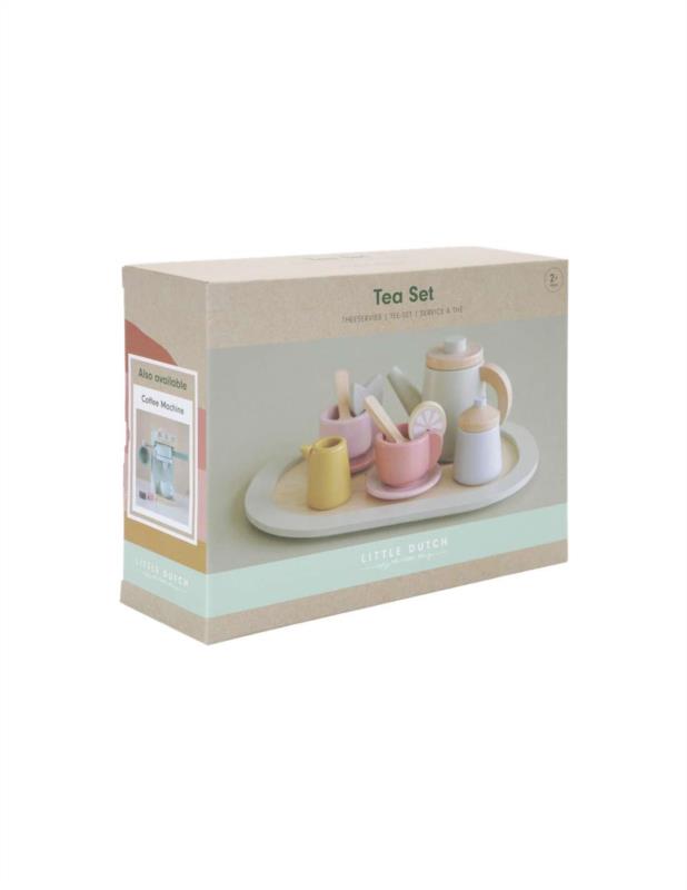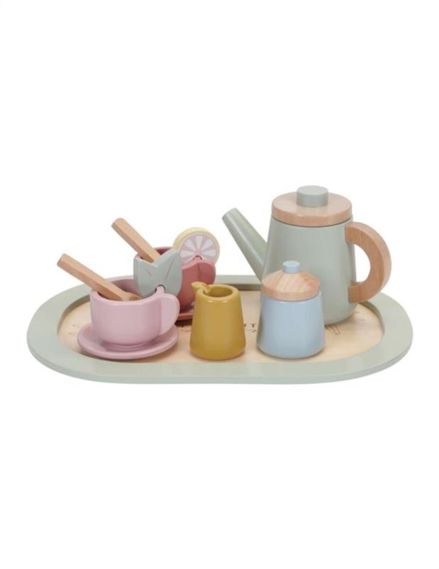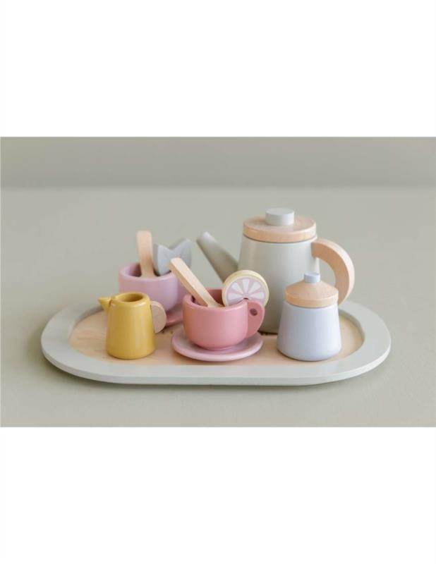 Características Material: madera, pintura a base de agua Medidas: 27,4 x 17,9 x 9cm Incluye:1 tetera de madera con tapa, 1 jarra de leche, 1 azucarero con tapa, 1 bandeja, 2 tazas, 2 platillos, 2 cucharitas, 1 rodaja de limón, 1 hoja de menta A partir de 3 años